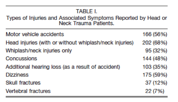 In a study at a tinnitus clinic, 297 out of 2400 patients reported that their tinnitus started within two weeks of a head or neck injury. The vast majority of these patients reported that tinnitus began immediately after or within 24 hours of their injury. 72% of the patients were male and 56% of the injuries occurred as a result of motor vehicle accidents.[2] The trauma patients also had significantly higher Tinnitus Severity Index scores.[3] Compared with other tinnitus patients at the clinic, trauma patients reported more problems sleeping, relaxing, concentrating, thinking clearly, and remembering things.[4]